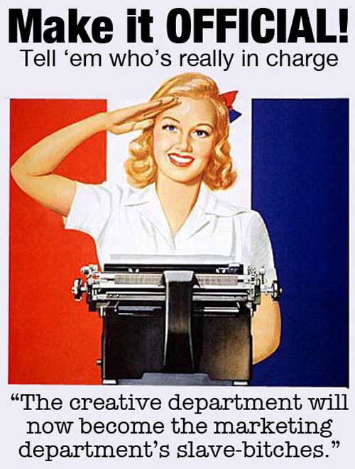 Happens like that every day, doesn’t it?! I used that exchange in a committee meeting in which the background color of an exclusive product was discussed and sampled for a week. The marketing manager turned to me and said that I had negated marketing’s input. I thought marketing’s responsibility was to figure out the target audience, their habits, income and so on and how to best reach them through media and other advertising venues — not how blue or green the product should be? Silly me! Maybe it’s a marketing secret that can’t be shared with creative. They’re spies for… something.